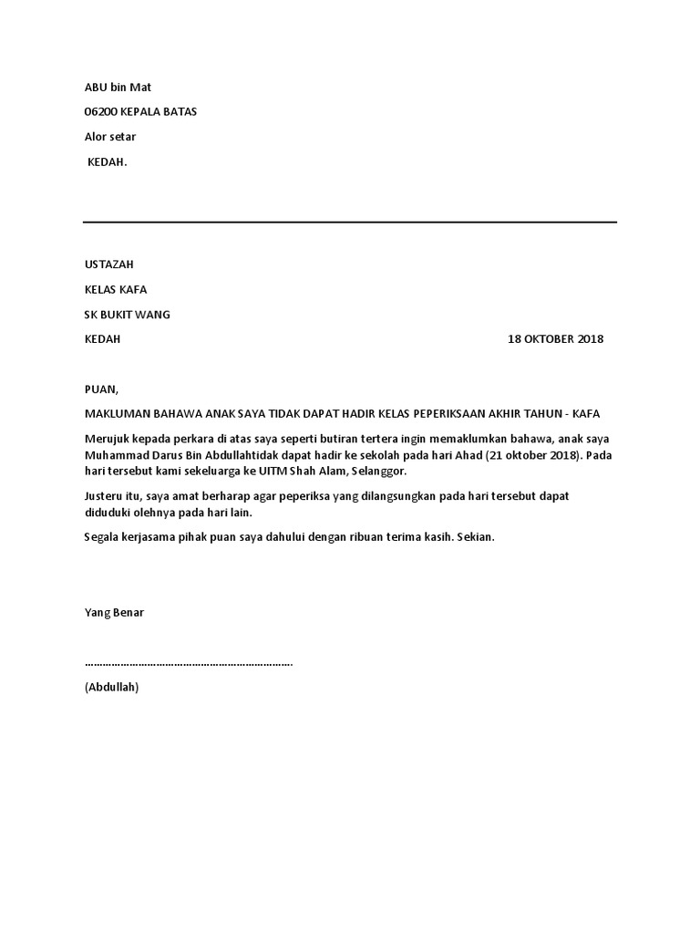 Pencen nanti ingat nak mai kerja jaga tandaeh kot. Contoh Surat Makluman Tidapat Hadir Peperiksaan. Other Apps - June 02 2022 Surat Rasmi Untuk Permohonan Cuti Sekolah 2018 Surat Rasmi Untuk Permohonan Cuti Sekolah Tahun Surat Rasmi Untuk Permohonan Cuti Sekolah Deepavali Surat Ra Surat.